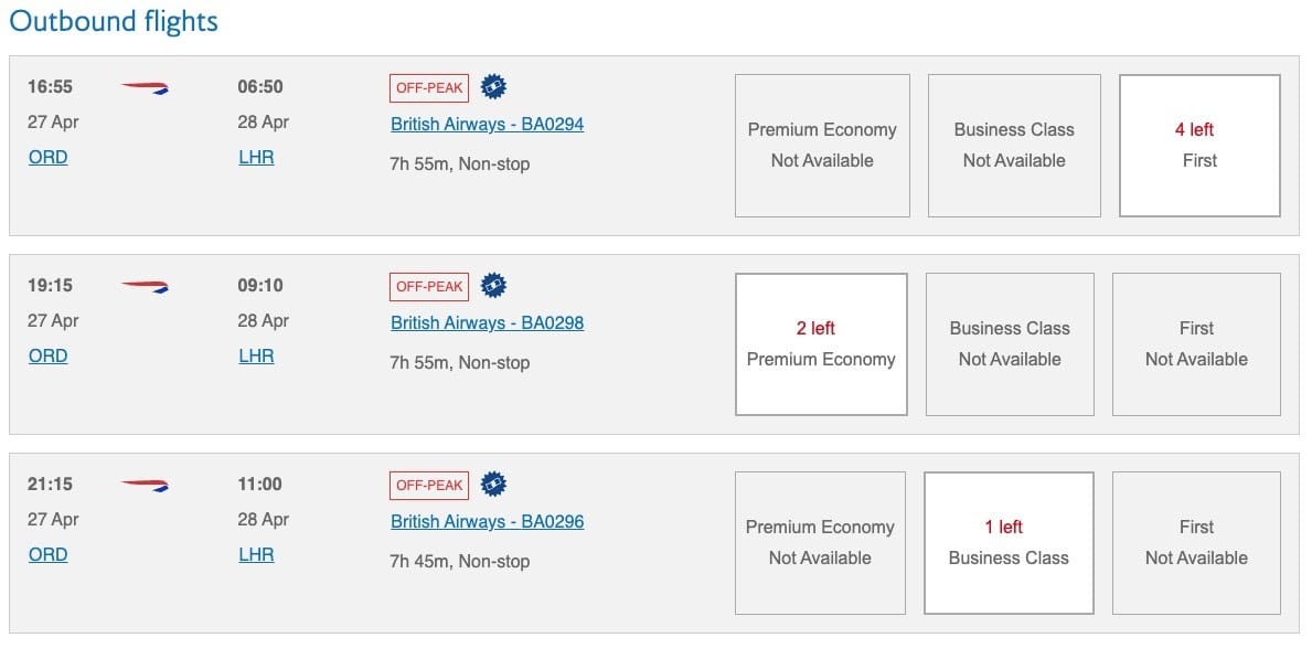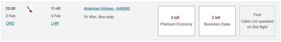 Right away, I found plenty of British Airways availability, but remember we’re looking for that AA flight, hoping it’ll be on the new plane when it launches.