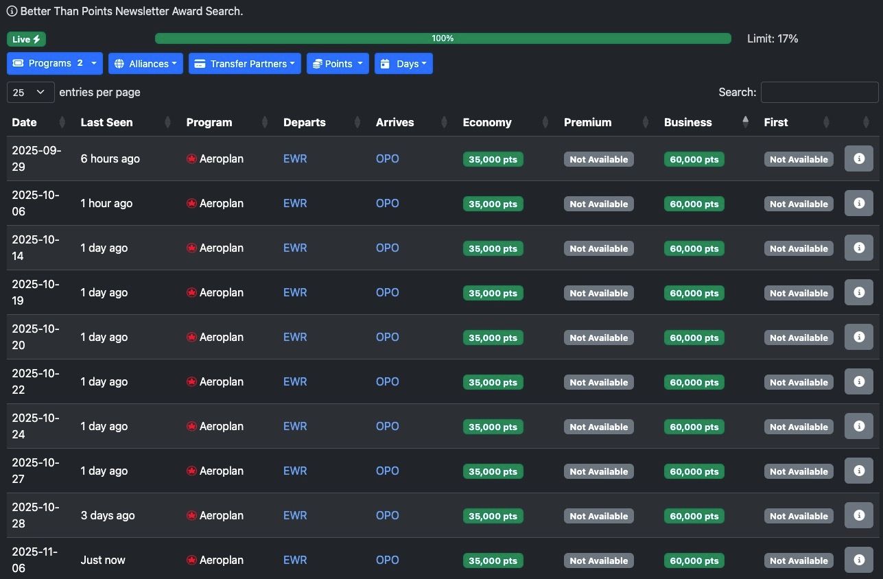 Some decent availability from EWR to OPO in October with up to 9 seats available!!